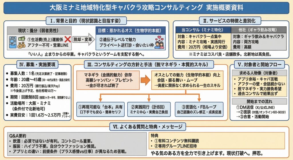 当コンサルは【ミナミの】【キャバクラ攻略】に絞った内容になります。ギャラ飲み指導はしません。